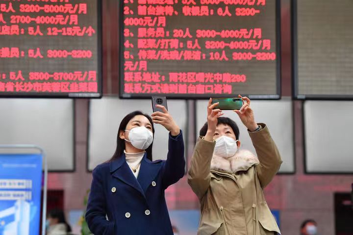 1月28日,在湖南长沙市人力资源市场,求职者了解岗位信息并拍照记录。新华社记者 陈泽国 摄