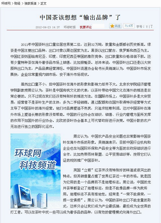 英国“立顿”红茶并没有特别好的味道或很突出的特点。但其销售量占据了世界红茶近一半的市场。就是因为它用的是一个品牌而不是地理标志。周云说,中国的龙井茶等都登记了地理标志,但是不能像品牌一样为我所用。地理标志不具有排他性。经常是“一荣不能俱荣,一损一定俱损”。周云认为,中国的茶叶出口不能走量的形式,这样只会让我们成为产业最低端,最后成为全世界的打工者。可以在茶叶中找一些可以成为奢侈品的品种,以有效的管理模式向海外出口。