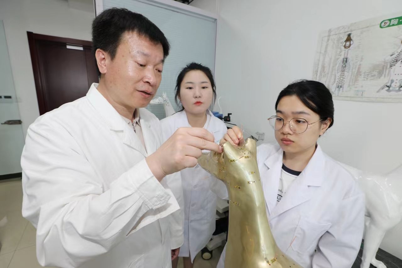 经过两年多的研发设计和技术调整,姜代勋及团队成员完成了1套雌雄犬腧穴定位练习模型、1套雌雄针灸铜犬和3套犬智能经络腧穴模型的制作。“我们研发的针灸铜犬体表有百余处用于腧穴快速准确定位的标志和近700个穴孔,学生可以根据这些标志揣摩腧穴位置,练习针刺操作。同时,我们也用不同颜色区分不同经脉的腧穴,帮助学生通过颜色了解经脉循行和腧穴分布的基本规律。”他说,犬智能经络腧穴模型,一侧可通过操作触摸屏演示十四经脉在犬模型体表的循行,加深学生对经脉循行路线的理解;另一侧可语音解读或显示屏显示经脉循行、腧穴定位、局部解剖、功能主治、操作方法等内容。