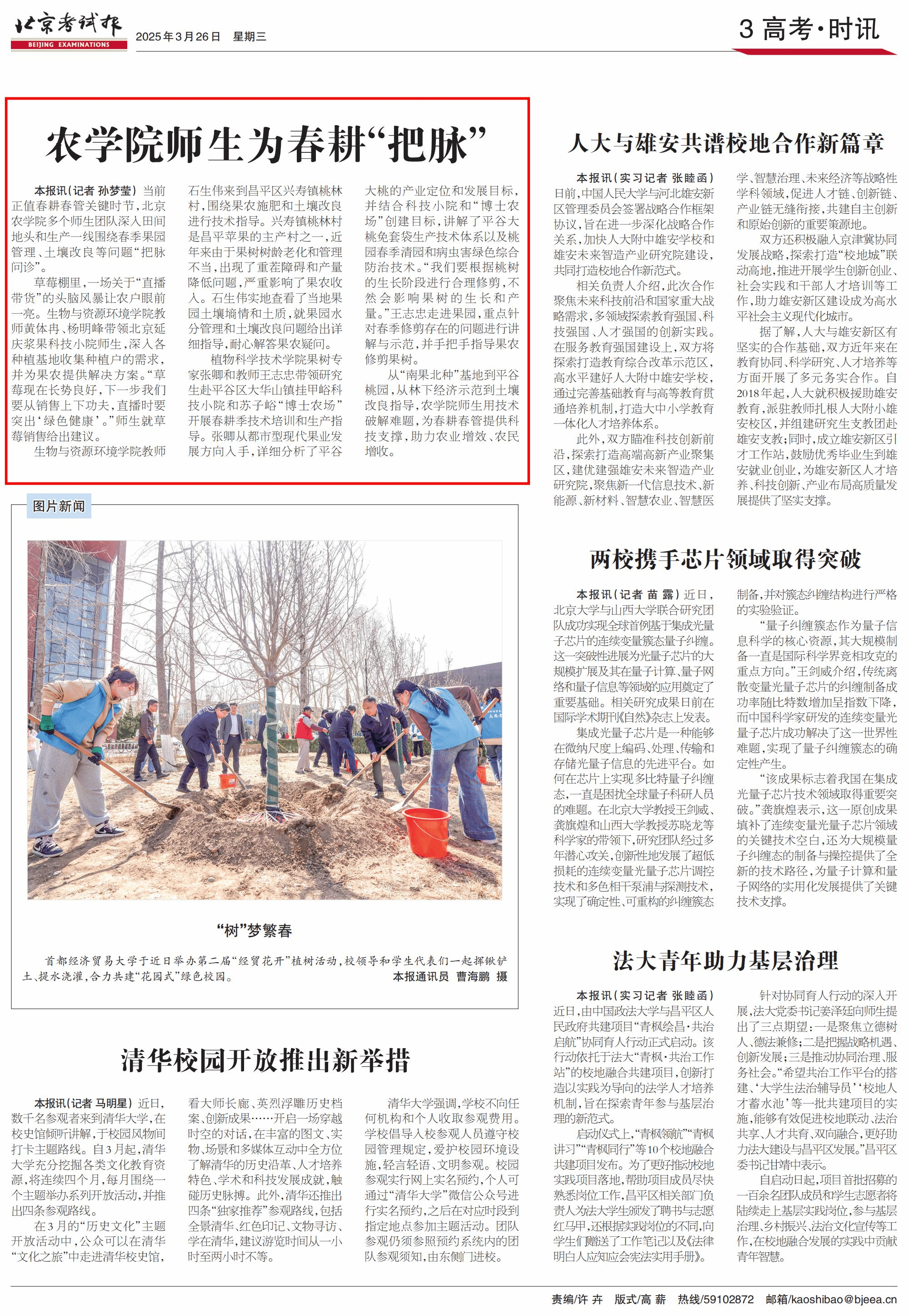 从“南果北种”基地到平谷桃园,从林下经济示范到土壤改良指导,农学院师生用技术破解难题,为春耕春管提供科技支撑,助力农业增效、农民增收。