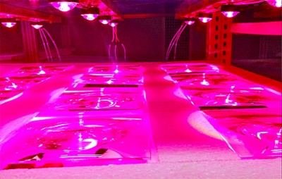 穿上实验防护装,戴上手套,“全副武装”的记者钻进了一个粉紫色的“梦幻世界”。只见数千束光从LED灯里发出,直射底端的白色“货架”,光的粉紫色将500多平方米的“工厂车间”照射得晶莹透亮。