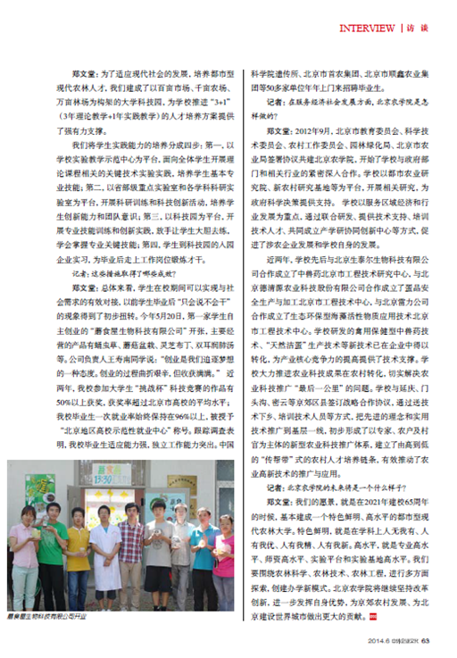 郑文堂:我们的愿景,就是在2021年建校65周年的时候,基本建成一个特色鲜明、高水平的都市型现代农林大学。特色鲜明,就是在学科上人无我有、人有我优、人有我精、人有我新。高水平,就是专业高水平、师资高水平、实验平台和实验基地高水平。我们要围绕农林科学、农林技术、农林工程,进行多方面探索,创建办学新模式。beat365中文官方网站将继续坚持改革创新,进一步发挥自身优势,为京郊农村发展、为北京建设世界城市做出更大的贡献。