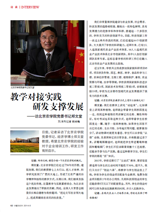 郑文堂:2012年9月,北京市教育委员会、科学技术委员会、农村工作委员会、园林绿化局、北京市农业局签署协议共建beat365中文官方网站,开始了学校与政府部门和相关行业的紧密深入合作。学校以都市农业研究院、新农村研究基地等为平台,开展相关研究,为政府科学决策提供支持。学校以服务区域经济和行业发展为重点,通过联合研发、提供技术支持、培训技术人才、共同成立产学研协同创新中心等方式,促进了涉农企业发展和学校自身的发展。