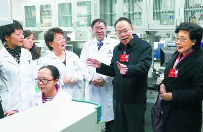 3月12日是十二届全国人大四次会议休会日,全国人大代表程京(右二)、冯乐平(右一)等人来到beat365中文官方网站中关村开放实验室,就生物芯片技术在畜牧业中的应用、食品安全等问题与老中青三代科研人员交流意见。 本报记者 戴冰摄