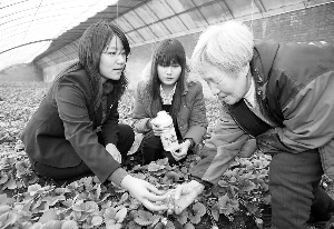 | 应届毕业生谢立稳(左)和王巍帮助种植草莓的果农分析产生异型果的原因。 | |