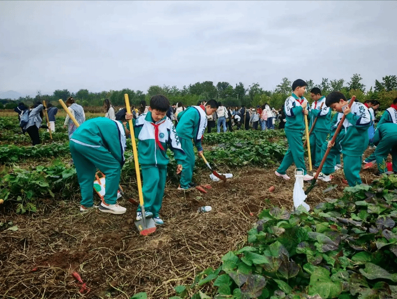 同学们拨开郁郁葱葱的红薯秧,小心翼翼地用铁锹铲开秧子根部的土,看见土地里冒出红色的红薯,按照老师教授的方法,在周边用力向下铲动土壤,再使劲一掀,终于将红薯从地里翻出来,喜悦之情溢于言表。田埂地头上,喜悦的笑脸、劳作的身影、满满的收获,共同织就一幅大美丰收图。