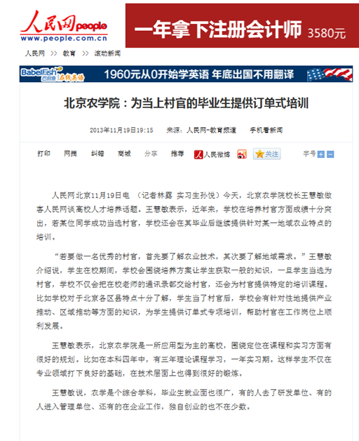 人民网北京11月19日电 (记者林露 实习生孙悦)今天,beat365中文官方网站校长王慧敏做客人民网谈高校人才培养话题。王慧敏表示,近年来,学校在培养村官方面成绩十分突出,若某位同学成功当选村官,学校还会在其毕业后继续提供针对某一地域农业特点的培训。