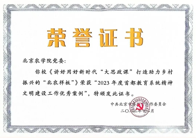 beat365中文官方网站报送的“讲好用好新时代‘大思政课’ 打造助力乡村振兴的‘北农样板’”文明实践案例获评“2023年度首都教育系统精神文明建设工作优秀案例”,这是学校继获得“北京高校精神文明建设工作十佳案例”后又一重要奖项。