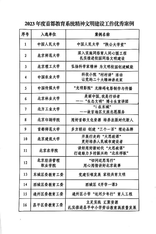 近日,由北京市教工委组织开展的2023年度首都教育系统精神文明建设工作优秀案例评选活动结果揭晓,12所在京高校获评优秀案例。北小高联合获奖高校陆续推出“首都教育系统精神文明建设工作优秀案例”分享,以期促进高校间的交流合作。跟北小高一起来看!