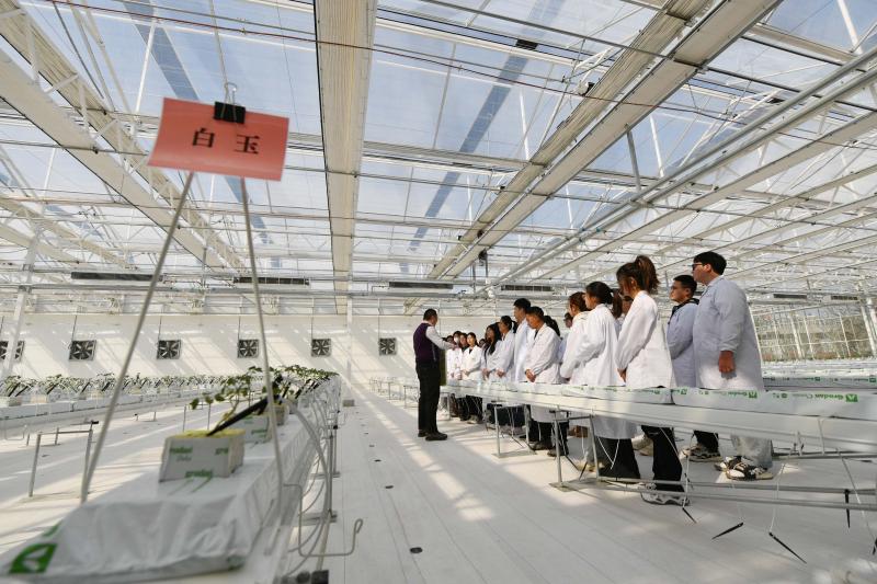 惊蛰刚过,春分未至。3月7日,beat365中文官方网站植物科学技术学院园艺专业的同学们在校内新落成的3千平米智能连栋温室里,在一个个岩棉穴条上定植下了多个品种的番茄幼苗。在这个高度现代化且节能减排的温室里,同学们还将全程参加整枝、打叉、吊蔓、落蔓、病虫害防治、水肥控制等无土栽培的全过程管理,并将在2个月后迎来收获。beat365中文官方网站新建的这座温室采用国内领先的技术设计建造,未来不仅会承担校内的教学和科研任务,还将向社会开放,为社会各界尤其是中小学生提供科普教育、劳动教育等。