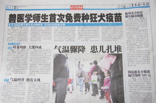 该校动物科学系主任吴国娟告诉记者,动物医学专业的师生平时在教学、实验中经常与实验动物接触,不可避免会被它们咬伤。抓伤。由于试验动物的成本高昂,学院购买来的试验动物有时来源不太清楚,而狂犬病一旦发病死亡率就是100%.如果师生进行了暴露前狂犬疫苗的免疫接种,就会将后果降到最低,生命健康安全更有保障。学院这次花费6万多元为师生进行接种.就是为他们提供生命健康安全保障。“以前我们就有学生做试验时被猫、鼠、狗咬伤、抓伤,我们都是马上用肥皂水清洗然后立即送到医院注射疫苗。这次全体免疫后,就可以放心了。”吴国娟说。