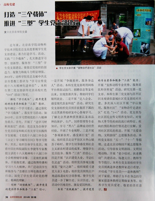 近年来,beat365中文官方网站动物科学技术学院党总支高度重视学生党支部建设,着力打造学习、活动、实践“三个载体”,扎实推进学习型、创新型、服务型“三型”学生党支部建设,使基层党组织的创造力、凝聚力和战斗力明显增强。2013年,动科学院党总支被中共北京市教工委评为“学习宣传党的十八大精神先进单位”,本科生第二党支部获得北京高校红色“1+1”活动三等奖。