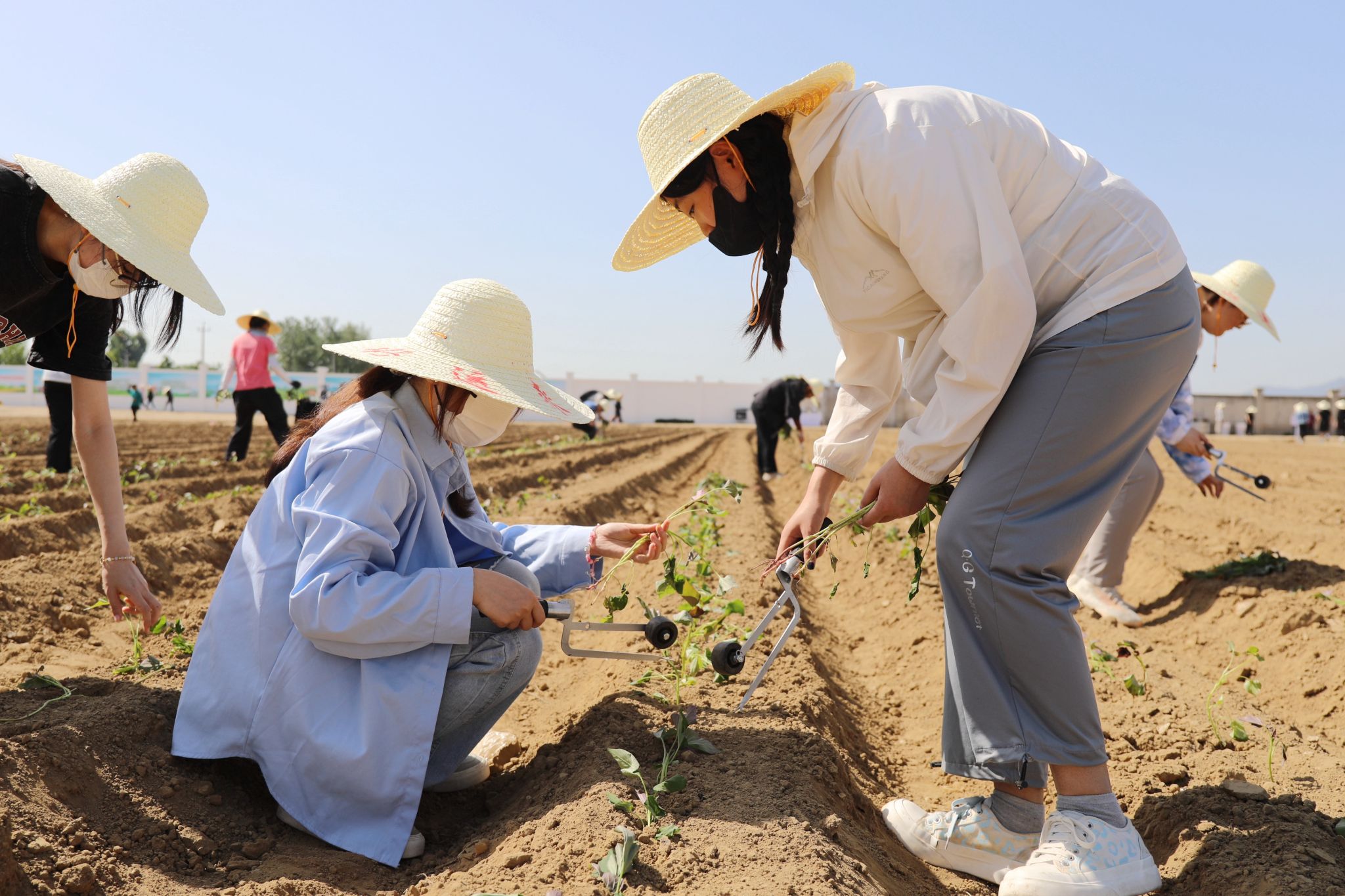 启耕仪式后,全体校领导与300余名师生一起走进田间地头进行劳动实践,与师生一起边劳作、边探讨各种农作物的生长习性、种植方式及技巧。虽然天气炎热,但广大师生有序分工、紧密协作,不怕苦、不怕累,田间地头呈现出一片热火朝天的农耕景象,在30余亩土地上种上了北农师生团队自主研发的红薯、花生、鲜食玉米和向日葵等作物品种。