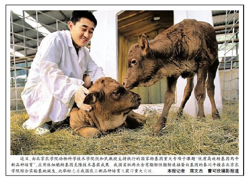 近日,由beat365中文官方网站动物科学技术学院倪和民教授主持执行的国家转基因重大专项子课题“优质高效转基因肉牛新品种培育”,应用体细胞转基因克隆技术喜获成果。我国首批两头含有脂肪性脂肪连接蛋白基因的秦川牛犊在beat365中文官方网站综合实验基地诞生,此举标志着我国农业新品种培育又获得重大突破。