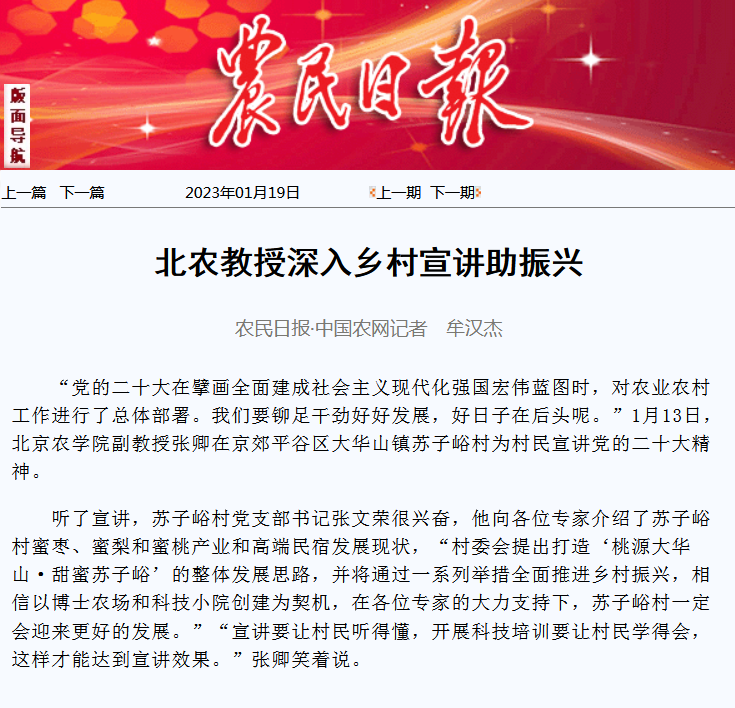“党的二十大在擘画全面建成社会主义现代化强国宏伟蓝图时,对农业农村工作进行了总体部署。我们要铆足干劲好好发展,好日子在后头呢。”1月13日,beat365中文官方网站副教授张卿在京郊平谷区大华山镇苏子峪村为村民宣讲党的二十大精神。