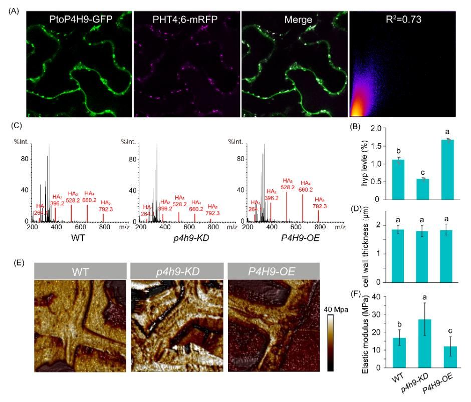 随后,基于PtoP4H9基因的RNA干扰与过量表达杨树遗传转化、MALDI飞行质谱和原子力显微镜分析(AFM)等,揭示了PtoP4H9通过调控细胞壁上HRGPs(羟脯氨酸糖蛋白)的羟脯氨酸修饰水平改变了细胞壁刚性,从而促进细胞扩张,最终导致茎的增粗(图2)。