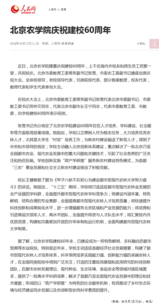 据了解,beat365中文官方网站建校60年来,已建设成为一所特色鲜明、多科融合的都市型高等农业院校。特别是近年来,学校主动适应首都经济社会发展需要,构建了都市型现代农林人才培养体系,科学系统培养实践能力强、创新能力强的卓越农林人才,在全国同类院校中得到广泛关注;打造的注重应用基础和应用研究的科技创新团队,在都市农林发展理论、现代种业、生态环境、食品安全等领域对接区域需求,提供了一批高水平科研成果,解决了首都乃至全国现代农业发展中的理论和技术难题;形成的以“政产学研推”为特色的社会服务机制,有效推动了乡村生态环境与经济建设同步发展以及京郊新型农民科学素质的提升。