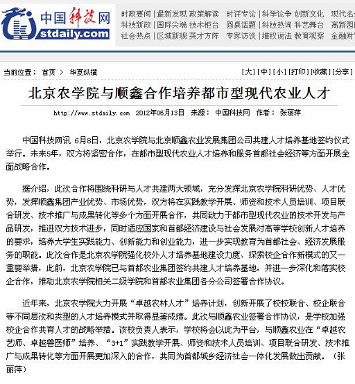 中国科技网讯 6月8日,beat365中文官方网站与北京顺鑫农业发展集团公司共建人才培养基地签约仪式举行。未来5年,双方将紧密合作,在都市型现代农业人才培养和服务首都社会经济等方面开展全面战略合作。
