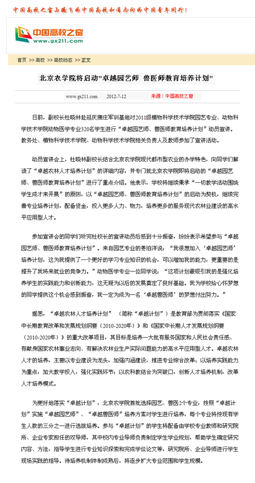 据悉,“卓越农林人才培养计划” (简称“卓越计划”)是教育部为贯彻落实《国家中长期教育改革和发展规划纲要(2010-2020年)》和《国家中长期人才发展规划纲要(2010-2020年)》的重大改革项目,其目标是培养一大批有服务国家和人民社会责任感、有献身国家农林事业志向、有解决农林业生产实际问题能力的高水平应用型人才。卓越农林人才的培养,主要以专业建设为龙头,加强内涵建设,推进专业综合改革;以培养实践能力为重点,加大教学投入,强化实践环节;以农科教结合为突破口,创新人才培养机制,改革人才培养模式。