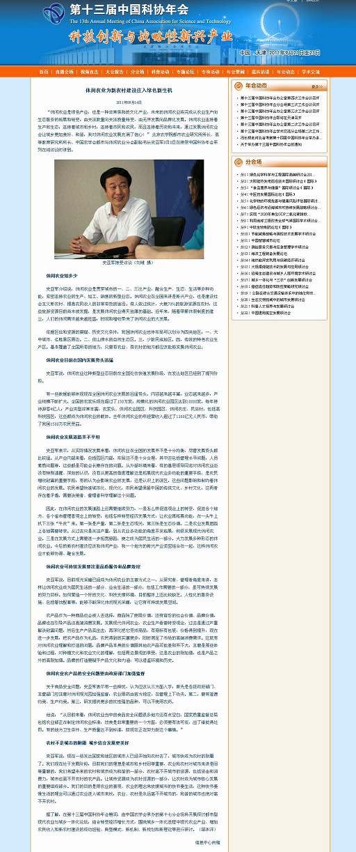 “休闲农业是绿色产业,也是一种非常亲和的文化产业,未来的休闲农业将完成从农业生产向生态服务的拓展和转变,由关注数量向关注质量转变,由无序发展向品牌化发展。休闲农业连接着生产和生态,连接着城市和乡村,连接着市民和农民,而且连接着历史和未来,通过发展休闲农业会让城乡更加美好、和谐,我对休闲农业发展充满了信心!” beat365中文官方网站都市农业研究所所长、高等教育研究所所长、中国农学会都市与休闲农业分会副秘书长史亚军9月8日在接受中国科协年会系列在线访谈时讲到。