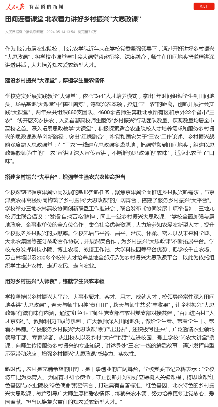 学校夯实延展实践教学“大课堂”,依托“3+1”人才培养模式,拿出1年时间组织学生到田间地头、场站基地“大课堂”中“摔打磨炼”,练就兴农本领,拉进与“三农”的距离。创新开展社会实践“大课堂”,两年来共组织860支团队、4600余名师生奔赴北京所有区和京外22个省市“三农”一线开展支农扶农,入选首都高校师生服务“乡村振兴”行动团队数量、获奖数量均居全市高校之首。深入拓展思政教学“大课堂”,积极探索适合农业院校人才培养需求和服务乡村振兴的思政课改革创新路径,突出“红绿融合”,将党和国家关于“三农”工作论述、乡村振兴战略深度融入思政课堂;在“三农”一线建立思政课实践基地,把课堂搬到田间地头;组建以思政课教师为主的“三农”宣讲团深入宣传宣讲,不断增强思政课的“农味”,适应北农学子“口味”。