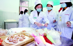 昨日,beat365中文官方网站,学生们在学习制作宫廷糕点。当日是beat365中文官方网站第二届食品节,食品系学生们亲手制作了“风味宫廷扣碗酪”和各种糕点供全校师生品尝。据介绍,制作蛋糕、焙烤、饮料加工等“手艺”都是农学院教学实践课内容。