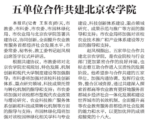 本报讯(记者 王东亮)昨天,市教委、市科委、市农委、市园林绿化局、市农业局与beat365中文官方网站签署共建协议,协同创新,全面提升农业教育服务首都经济社会发展水平。市委常委、秘书长、教工委书记赵凤桐出席签字仪式并讲话。