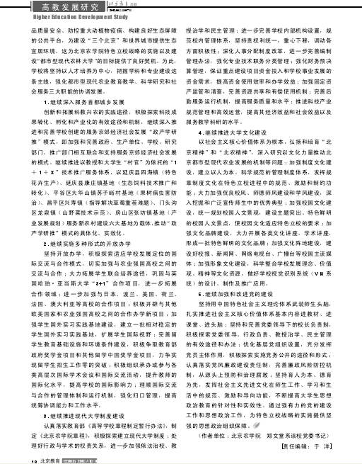 学校针对首都新农村建设和都市型现代农业发展需求,构建和完善了植物科学学科群、畜牧兽医学科群、农林经济与法文学科群、生物技术与食品学科群、生态环境建设与城镇规划学科群,突出了农科特色和优势,确立了农、工、管主干学科地位,基本形成了特色鲜明多科融合的办学格局。学校现有 7 个涉农类一级学科,3个涉农类国家级特色专业,1 个涉农类北京市大学科技园,5 个涉农类北京市重点学科,7 个涉农类省部级研究机构。我们认识到这样的办学定位就是特色、就是优势、就是核心竞争力,必须保持并不断强化,不贪多、不图全,要有选择地追求卓越。