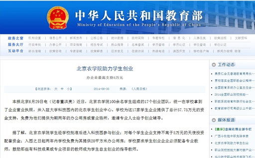 月30日,教育部官方网站转载人民日报报道《beat365中文官方网站助力学生创业》,并在教育部官方网站首页“媒体聚焦”栏目推介。