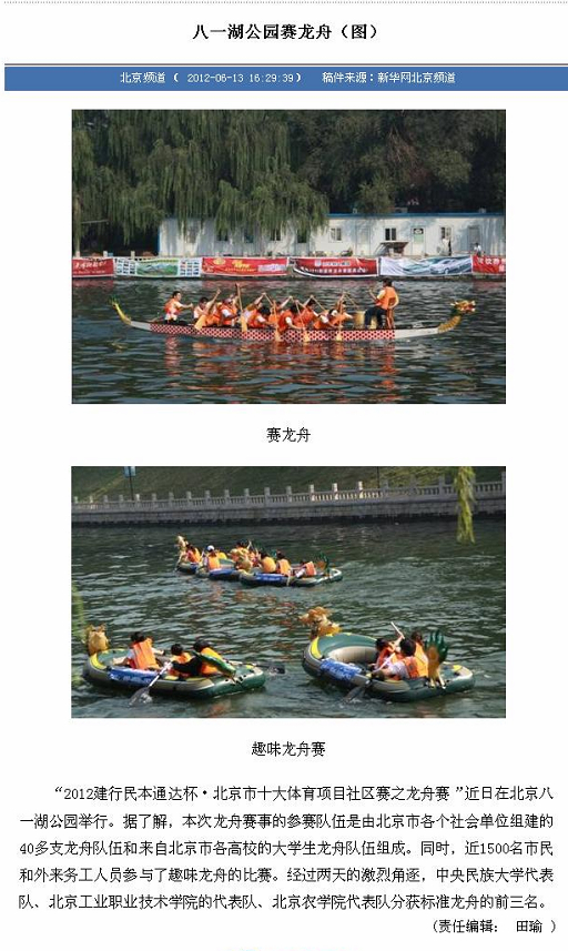 “2012建行民本通达杯·北京市十大体育项目社区赛之龙舟赛”近日在北京八一湖公园举行。据了解,本次龙舟赛事的参赛队伍是由北京市各个社会单位组建的40多支龙舟队伍和来自北京市各高校的大学生龙舟队伍组成。同时,近1500名市民和外来务工人员参与了趣味龙舟的比赛。经过两天的激烈角逐,中央民族大学代表队、北京工业职业技术学院的代表队、beat365中文官方网站代表队分获标准龙舟的前三名。