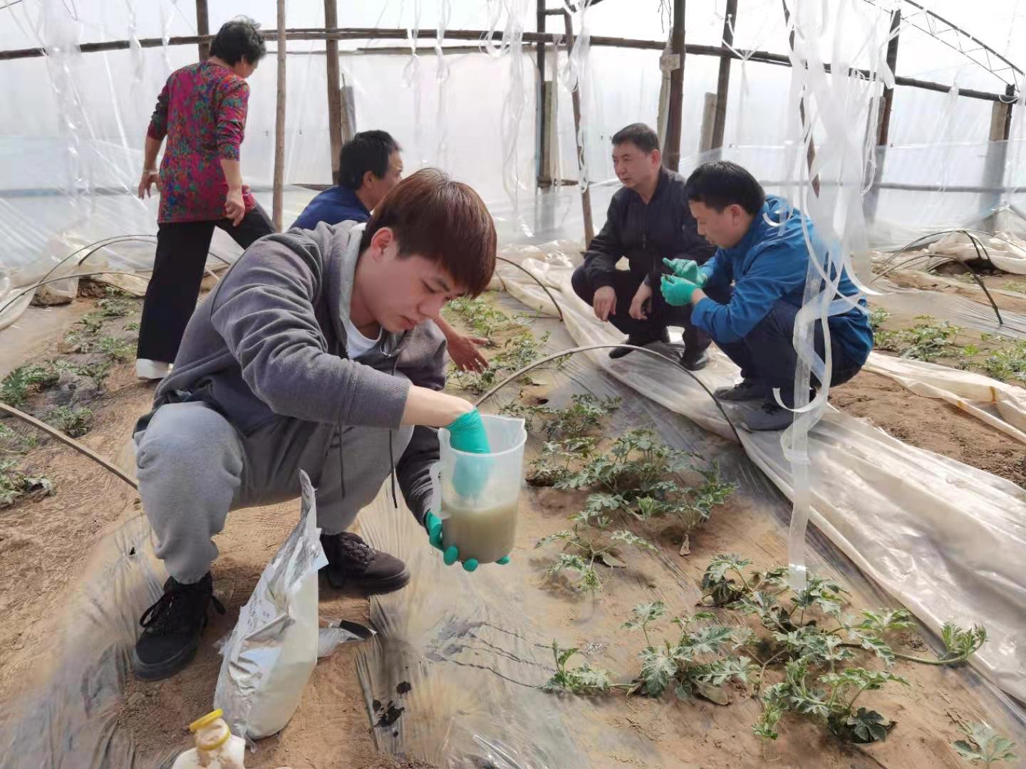时值西瓜定植和缓苗的关键期,beat365中文官方网站植物保护系师生来到北京市大兴区庞各庄镇西瓜大棚调查西瓜生长及病虫害发生情况,并向瓜农提供了防病促生的微生物菌剂。此外,该校教师任争光和研究生黄添杨还特别示范了菌剂的使用方法。