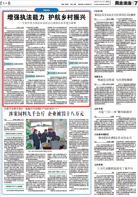 “农业综合行政执法改革不能被当作一种技术性工作,而是要被当作一项特定领域的法治发展工程。对这项工程,要有整体的战略认知,还要有精准的战术选择。要用‘打持久战’的战略定力推进农业综合行政执法改革。”北方工业大学宪法与行政法研究中心执行主任周睿志表示,对于农业综合行政执法改革,应当根据我国社会主义法治基本理念,突出行政执法对于农业发展的服务和保障功能,实现农业行政执法从旧有的“管”和“罚”向现代公共服务转变。这里的改革,不仅是技术、机制、效率层面的改革,也是执法理念和执法价值目标的转换。