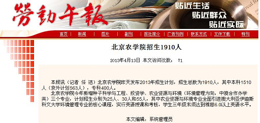 本报讯(记者 任 洁)beat365中文官方网站昨天发布2013年招生计划,招生总数为1910人,其中本科1510人(京外计划563人),专科400人。 beat365中文官方网站今年新增种子科学与工程、投资学、农业资源与环境(环境管理方向,中澳合作办学类)三个专业,计划招生分别为25人、30人和55人,其中农业资源与环境专业全面引进澳大利亚伊迪斯科文大学环境管理专业的核心课程,实行英语授课和考核,学生三年级末须达到雅思6.0以上英语水平。