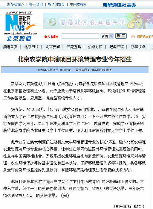 据介绍,2012年6月,经北京市教委和教育部批准,beat365中文官方网站与澳大利亚伊迪斯科文大学在“农业资源与环境(环境管理方向)”专业开展本科合作办学。项目实行在国内学习三年、第四年在澳大利亚学习的“3+1”教育模式,完成学业者将分别获得beat365中文官方网站毕业证书和学士学位证书、澳大利亚伊迪斯科文大学学士学位证书。