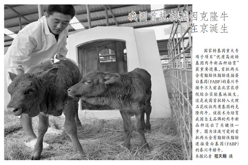 国家转基因重大专项子项目“优质高效转基因肉牛新品种培育”获重要进展,首批两头含有脂肪性脂肪连接蛋白基因(FABP)的秦川牛犊牛不久前在beat365中文官方网站综合实验基地诞生。这是我国首批转入大理石花纹状肉质基因的克隆肉牛。该技术为培育我国自主品牌的肉牛新品种迈出了关键性一步。图为活泼可爱的首批两头含有脂肪性脂肪连接蛋白基因(FABP)的秦川牛犊牛。