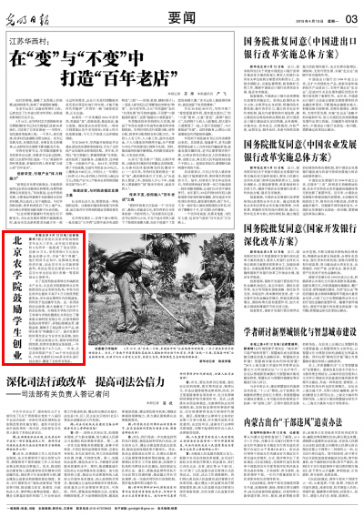 本报北京4月12日电(记者张景华)谢云浩是beat365中文官方网站动物医学专业大三学生,去年他与同宿舍的6名同学一起组成了创业团队,自凑10万元,学校资助5万元创业基金注册公司,开始“林下养鹅”。他们利用专业知识,发挥绿化林地经济价值,创业仅半年公司就获得盈利,其创业项目还荣获2014年北京市大学生创业设计竞赛一等奖和创业之星称号。