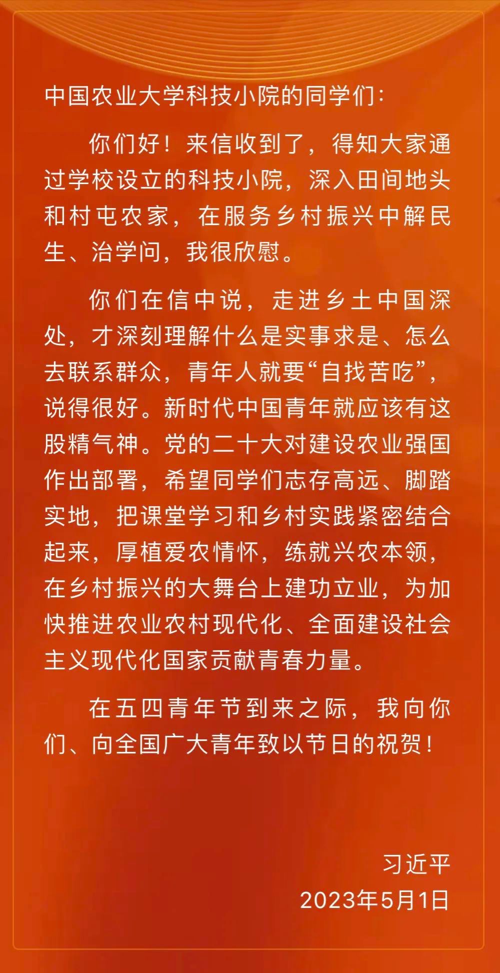 5月1日,中共中央总书记、国家主席、中央军委主席习近平给中国农业大学科技小院学生回信,对他们深入田间地头和村屯农家,在服务乡村振兴中解民生、治学问表示肯定,并寄语同学们志存高远、脚踏实地,把课堂学习和乡村实践紧密结合起来,厚植爱农情怀,练就兴农本领,在乡村振兴的大舞台上建功立业,为加快推进农业农村现代化、全面建设社会主义现代化国家贡献青春力量。