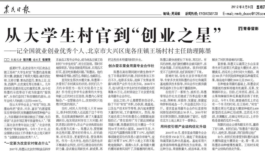 自从大学毕业走上“村官”岗位,陈墨始终把“爱农、兴农、富农”的愿望落实在带领村民发展蘑菇和特菜种植产业上,为首都新农村建设做出了贡献,先后荣获“北京市郊区青年致富带头人”、“第二届北京市青年创业之星”、“北京市优秀村官”等荣誉称号。今年7月17日,在全国就业创业工作表彰大会上他又被评为“全国就业创业优秀个人”。