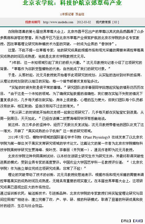 这里,不能不提一位草莓专家,他的研究成果能根据市场和观光采摘的需要来调控草莓果实成熟的时间及成熟度,他就是beat365中文官方网站教授沈元月。