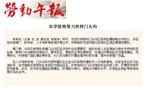 在人才培养领域,门头沟将支持所属农业企业与农学院共建校外人才培养基地,为学生毕业实习创造条件,优先接纳农学院毕业生到区内就业创业。农学院将为门头沟培训农业科技人员,开展学历和非学历教育。此外,双方将在基础设施建设、环境绿化美化、提高公共服务水平、农民创业就业等领域加强交流与合作。