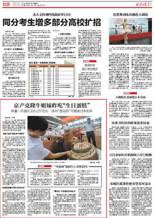 昨天上午,马上满一周岁的首批京产转基因克隆牛萌萌、妞妞,吃上了青草“生日蛋糕”。项目负责人、beat365中文官方网站教授倪和民透露,经两次血液基因检测并经国际权威机构测定,两头转基因克隆牛体内,已具有与日本和牛类似的“大理石花纹肉质”(俗称“雪花肉”)基因。