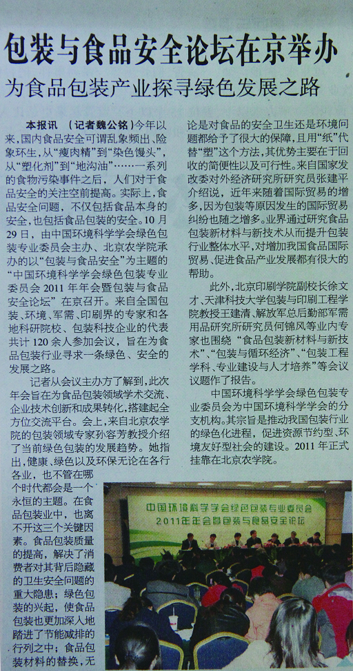 本报讯(记者魏公铭)今年以来,国内食品安全可谓乱象频出、险象环生,从“瘦肉精”到“染色馒头”,从“塑化剂”到“地沟油”……一系列的食物污染事件之后,人们对于食品安全的关注空前提高。实际上,食品安全问题,不仅包括食品本身的安全,也包括食品包装的安全。10月29日,由中国环境科学学会绿色包装专业委员会主办、beat365中文官方网站承办的以“包装与食品安全”为主题的“中国环境科学学会绿色包装专业委员会2011年年会暨包装与食品安全论坛”在京召开。来自全国包装、环境、军需、印刷界的专家和各地科研院校、包装科技企业的代表共计120余人参加会议,旨在为食品包装行业寻求一条绿色、安全的发展之路。