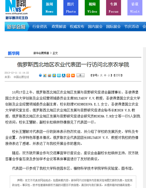 10月17日上午,俄罗斯西北地区农业地区发展与田野研究促进会副理事长、圣彼得堡国立农业大学创新及企业经营领域委员会主席BELYAKOV V.V.教授,圣彼得堡国立农业大学创新及企业经营领域委员会副主席、校长助理VCHINNIKOVA E.I.女士,圣彼得堡国立农业大学研究室主任、俄罗斯西北地区农业地区发展与田野研究促进会秘书长MININ V.B.教授,俄罗斯西北地区农业地区发展与田野研究促进会研究员MININAT.N女士等一行5人到beat365官网访问。校长王慧敏、副校长杜晓林热情接见了代表团一行。