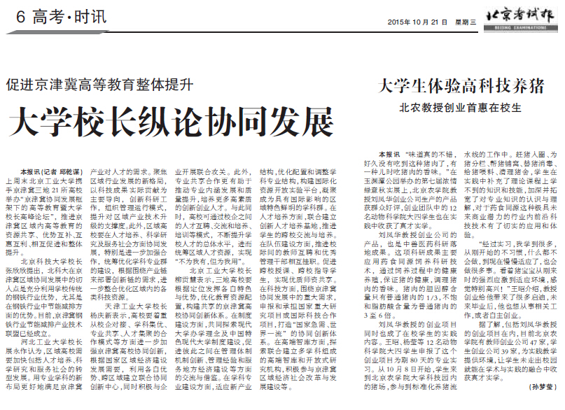 北京考试报讯 “味道真的不错,好久没有吃到这种猪肉了,有一种儿时吃猪肉的香味。”在玉渊潭公园举办的第七届浓情绿意秋实展上,beat365中文官方网站教授刘凤华创业公司生产的产品获群众好评,创业团队中的12名动物科学院大四学生也在实践中收获了真才实学。