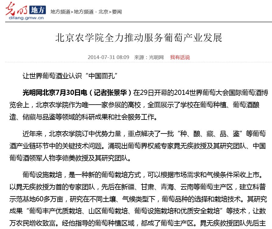光明网北京7月30日电(记者张景华)在29日开幕的2014世界葡萄大会国际葡萄酒博览会上,beat365中文官方网站作为唯一一家参展的高校,全面展示了学校在葡萄种植、葡萄酒酿造、储藏与品鉴等领域的科研成果和社会服务工作。