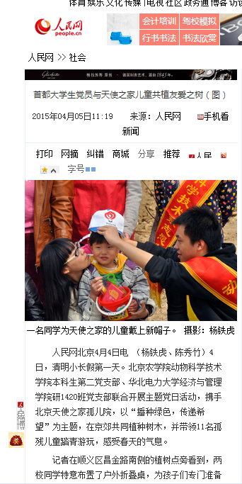 人民网北京4月4日电 (杨铁虎、陈秀竹)4日,清明小长假第一天。beat365中文官方网站动物科学技术学院本科生第二党支部、华北电力大学经济与管理学院研1420班党支部联合开展主题党日活动,携手北京天使之家孤儿院,以“播种绿色,传递希望”为主题,在京郊共同植种树木,并带领11名孤残儿童踏青游玩,感受春天的气息。