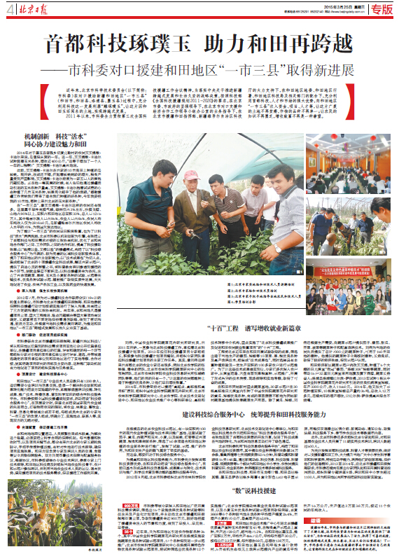 为了能让“一市三县”的农民早日脱贫致富,也为了让科技“活水”涓涓流淌,北京市科委以机制创新为引擎,有效建立了首都科技与和田需求对接的长效协商机制,优化了京和两地合作部门之间、工作团队之间的合作机制,提高了科技援助效率;以“既授以鱼,又授以渔”的援疆模式,构建了以“科技综合服务中心”为代表的、较为完善的区域科技创新服务体系,提升了和田地区的自主创新能力;以“技术成果包”为切入点,集成组装了北京的十项援疆农业科技成果,赠送百家示范户,提供了启迪心灵的智慧之书,将科普教育培训渗透到援建的各个环节,使就业渠道不断拓宽;以科技援疆资金为依托,攻克了百余项蔬菜、果树、玉米及小麦新品种的试验、示范等关键技术,优良品种试验示范、辐射推广取得实质性进展,大大地促进了农业、农林产品加工业,以及医药业的快速发展。