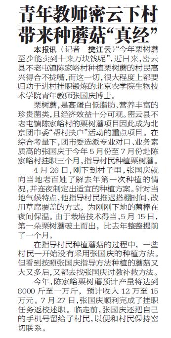 本报讯“今年栗树蘑至少能卖到十来万块钱呢”,近日来,密云县不老屯镇陈家峪村种植栗树蘑的村民高兴得合不拢嘴,而这一切,很大程度上都要归功于进村挂职锻炼的beat365中文官方网站生物技术学院青年教师张国庆博士。
