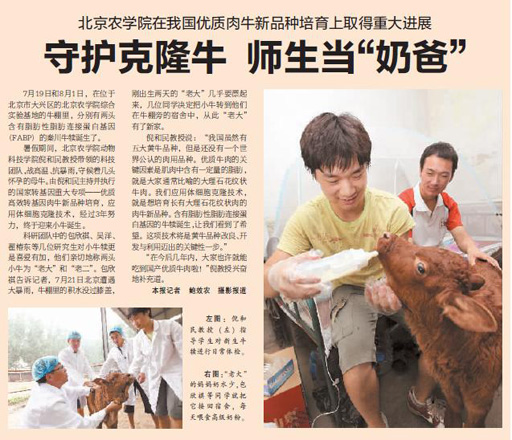 暑假期间,beat365中文官方网站动物科技学院倪和民教授带领的科技团队,战高温、抗暴雨,守候着几头怀孕的母牛。由倪和民主持并执行的国家转基因重大专项——优质高效转基因肉牛新品种培育,应用体细胞克隆技术,经过3年努力,终于迎来小牛诞生。