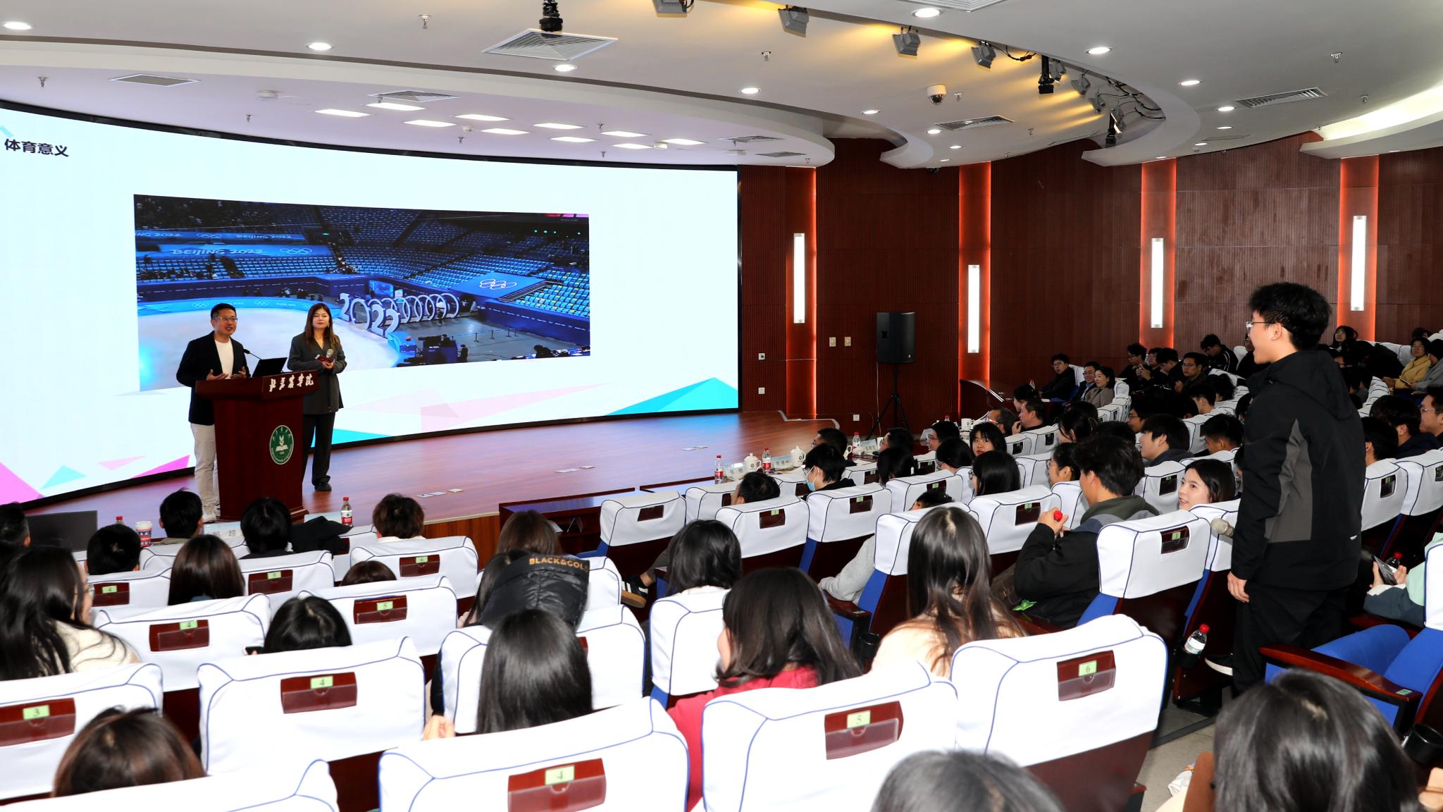 孙海光曾是2008年北京夏季奥运会、残奥会以及2022年北京冬季奥运会、残奥会的注册记者,在讲述自己参与奥运会的经历和感受之外,他还分享了运动员郑钦文和倪夏莲的拼搏故事。谈到“体育人生”带来的启发,他引用新中国体育界第一位世界冠军容国团一句话“人生能有几回搏,此时不搏更待何时?”与台下学子们共勉。